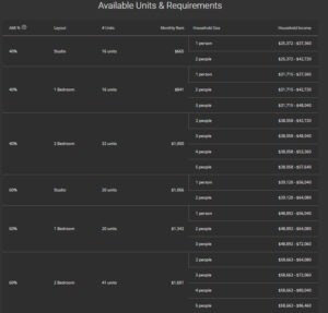 الوحدات عبارة عن مزيج من الإستوديوهات والشقق/غرفة نوم واحدة وغرفتي نوم. الوحدات السكنية متاحة عبر اليانصيب للأسر التى تحصل على مستويات دخل تبلغ 40 و 60 في المائة من متوسط ​​الدخل في المنطقة (AMI) – أو تلك التي يتراوح دخلها المؤهل بين 25,372 دولار و 86,460 دولار سنويا.