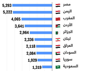 وجاءت الأردن في المرتبة الرابعة بإجمالي 3641 تأشيرة، تليها الجزائر (2964 تأشيرة)، ولبنان (2336) تأشيرة والعراق (2118) تأشيرة، والسودان (2084) تأشيرة، وسوريا (1929) تأشيرة، والسعودية (1319) تأشيرة، والإمارات (1192) تأشيرة، والصومال (746) تأشيرة، والكويت (497) تأشيرة، وليبيا (488) تأشيرة، وتونس (285) تأشيرة، وقطر (227) تأشيرة، وموريتانا (168) تأشيرة، وجيبوتي (114) تأشيرة، وسلطنة عمان (50) تأشيرة، والبحرين (41) تأشيرة.
